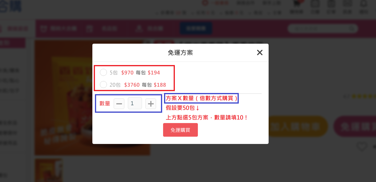 3. 會彈跳出一個購買小視窗,當您選擇完方案後再次點擊【免運購買】。
