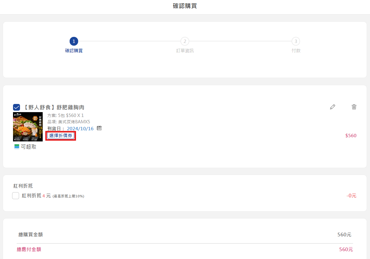 4. 會跳轉到【確認購買】的頁面,同時❗此頁面的下方就會有【選擇折價券】可以點擊。