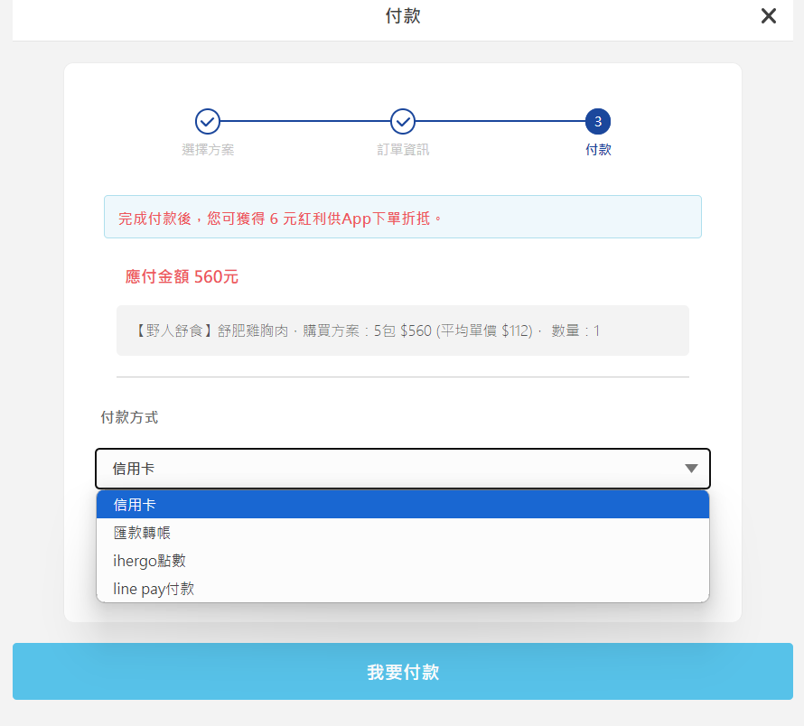 待您按下一步後,即跳轉付款頁面,完成付款才算訂單成立喔!