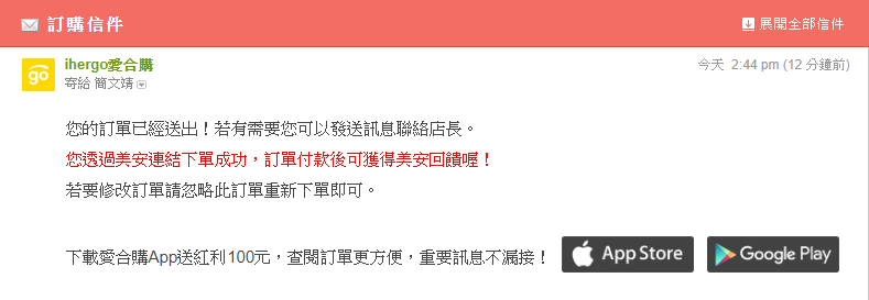 下訂單結束之後您可以至訂購單訊息內確認有沒有出現系統提示文字「您透過美安連結下單成功,訂單付款後可獲得美安回饋喔!」